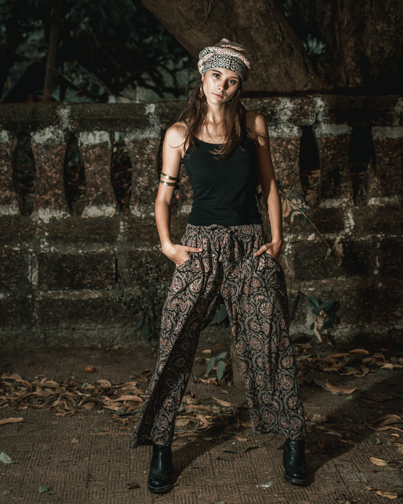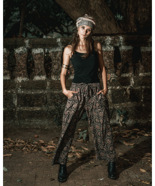 Fabriqué en coton pur, ce qui le rend confortable et respirant. Imprimé à la main avec la technique traditionnelle du bloc du Rajasthan, ce qui lui donne un aspect unique et original difficile à trouver. La teinture utilisée est faite de couleurs naturelles et de boue, ce qui non seulement ajoute à l'esthétique du pantalon, mais respecte également l'environnement.